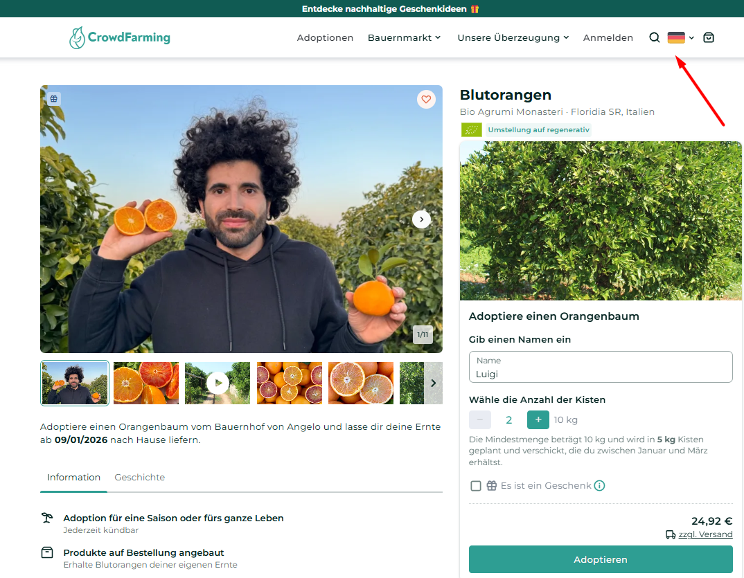 Beispiel: Wenn du eine Adoption eines italienischen Orangenbaums abschließt und die Kisten nach Deutschland versenden möchtest, wähle bitte Deutschland als Lieferland. Innerhalb Deutschlands kannst du die Kisten anschließend an verschiedene Adressen im gesamten Postleitzahlengebiet senden.