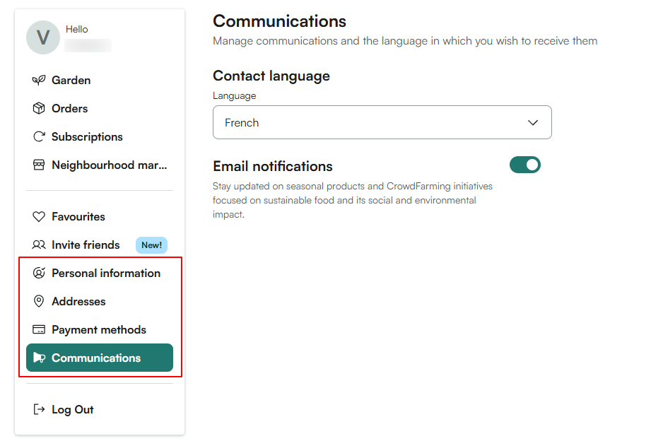 Du kan uppdatera dina personuppgifter, adresser, betalningsmetoder och kommunikationspreferenser direkt från ditt konto. Hur du kommer åt dina kontoinställningar Logga in på CrowdFarming. Klicka på d…